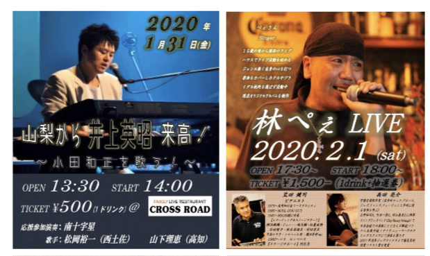 井上英昭南十字星ライブ 1月31日(金) 1月31日(金) 会場 CROSS ROAD 開場 13:30 開宴 14:00~ チケット 500円(1ドリンク付) 出演 14:00~ 松岡裕一 14:15~ 山下理恵